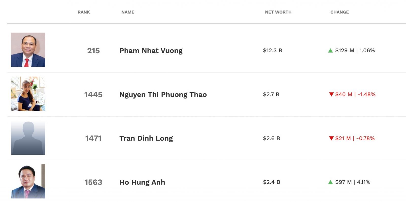 Trong đó, ông Phạm Nhật Vượng ghi nhận mức tăng mạnh nhất, thêm 129 triệu USD, nâng tổng tài sản lên 12,3 tỷ USD và đứng ở vị trí thứ 215 trên bảng xếp hạng. Tài sản của ông Hồ Hùng Anh tăng thêm 97 triệu USD, đạt mức 2,4 tỷ USD. Ông Nguyễn Đăng Quang cũng có thêm 59 triệu USD, nâng tổng tài sản lên 1,2 tỷ USD.